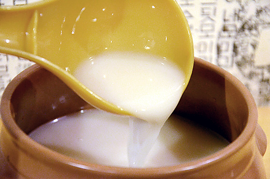 韓国の代表的な伝統酒で、米と小麦の麹で仕込んだ酒の上澄み(清酒になる部分)と下の濁った部分をそのまま“マッ”(すべて)“コルダ”(漉す)ことから「マッコリ」と呼ばれるようになりました。