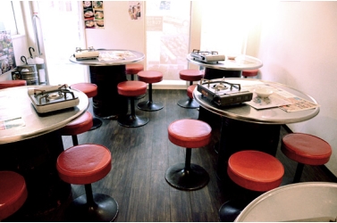 店内はこじんまりとしたアットホームな雰囲気で、韓国屋台のような丸テーブルで棚にはマッコリのボトルが所狭しと並べてあります。お店には常に60種類以上のマッコリが用意されている日本初のマッコリバーでもあります。日本と韓国で受賞したものや、珍しいマッコリまで取り揃えてあります。